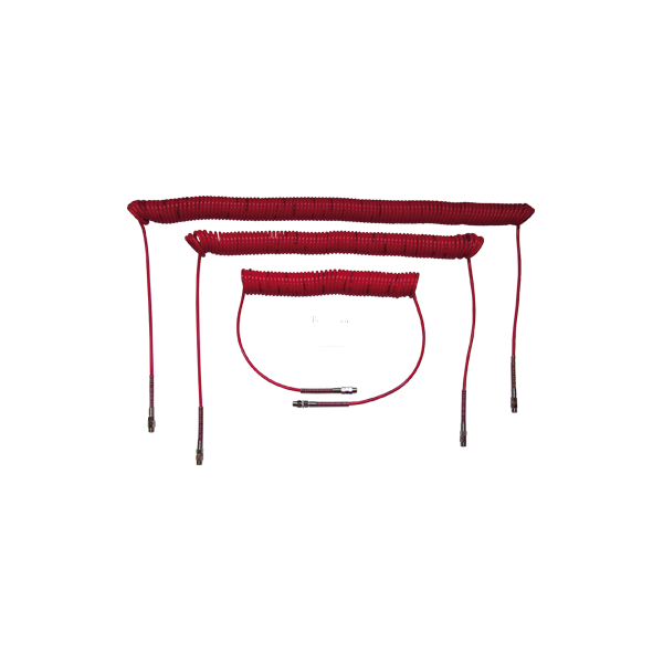 Tuyau SPIRALE PU standard en polyuréthane ROUGE. Ø spirale : 8 x 5 mm. Longueur 12 m. monté avec 2 raccords TOURNANTS mâle 1/4.