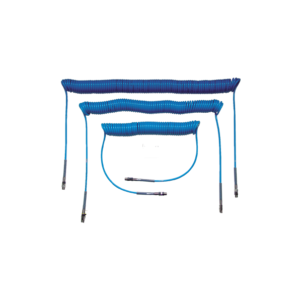 Tuyau SPIRALE PU 95 en, polyuréthane BLEU renforcé. Ø spirale : 8 x 5 mm. Longueur 17 m. monté avec 2 raccords TOURNANTS mâle 1/4, un raccord rapide femelle 5810211 et un embout femelle 5811141.